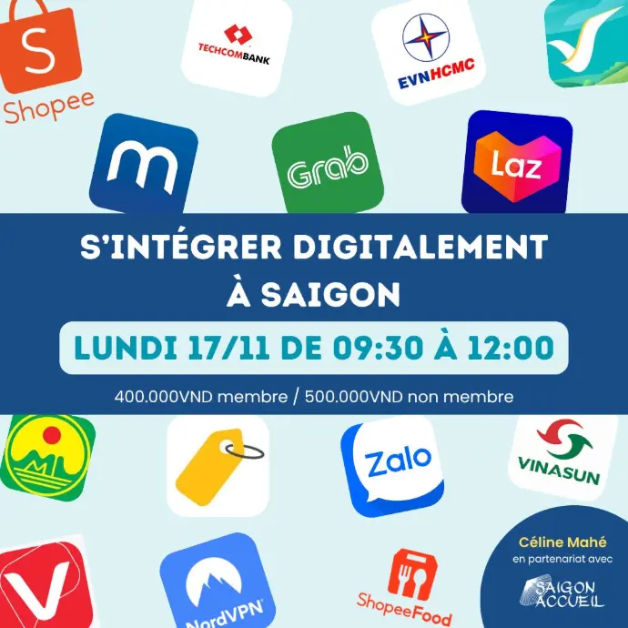Résidente à Saigon depuis plus de 4 ans, Céline utilise au quotidien ces applications qui lui simplifient la vie. Elle partagera avec vous son expérience, vous présentera les applications les plus utilisées, ses recommandations et vous dévoilera ses astuces avec pour objectif de vous faciliter la vie et d'accélérer votre intégration ! 🚀