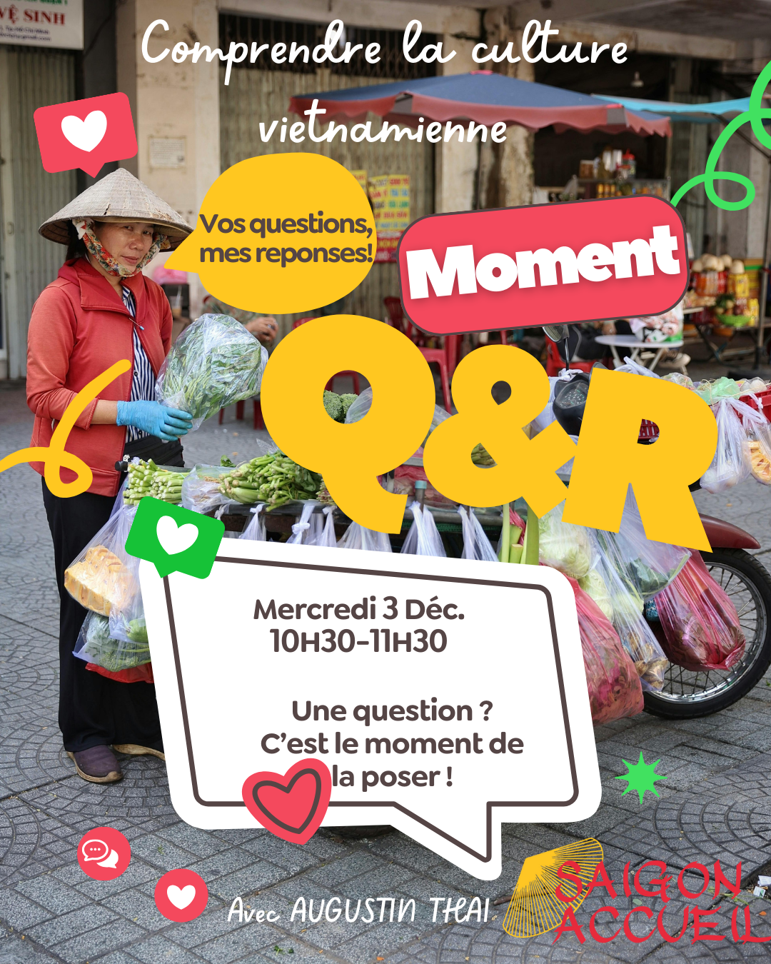 Un moment d'échange où vous pouvez (enfin !) poser toutes vos questions sur la vie vietnamienne. Culture, codes sociaux, fonctionnement des familles, habitudes locales, petites curiosités du quotidien… On décrypte tout ensemble avec notre professeur de vietnamien débrouillardise, Augustin. Venez poser toutes vos questions!